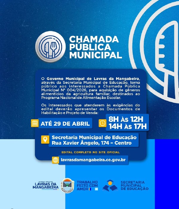 O Governo Municipal de Lavras da Mangabeira informa que dia de 02 de maio de 2025 (sexta-feira) será ponto facultativo.